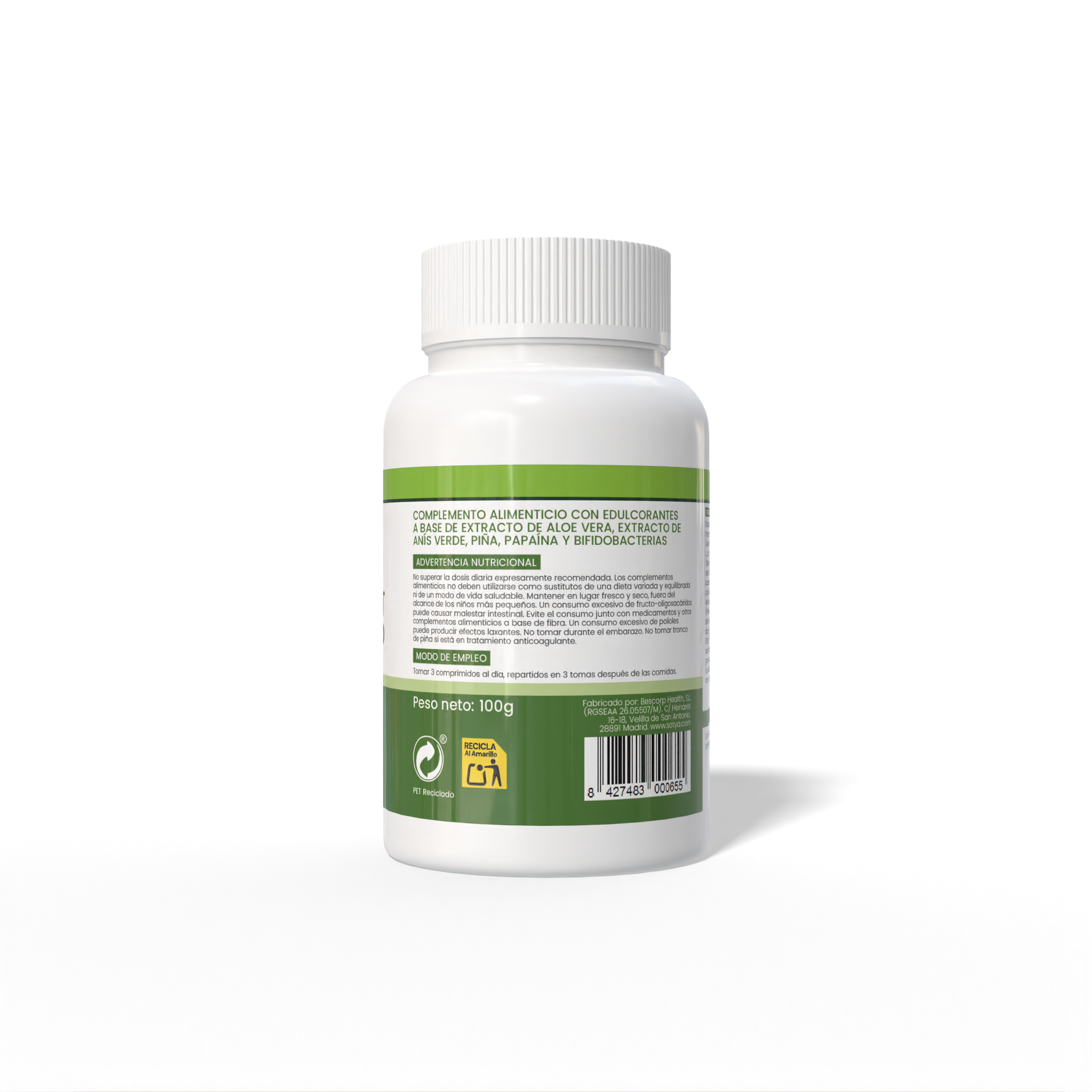 No superar la dosis diaria expresamente recomendada. Los complementos alimenticios no deben utilizarse como sustitutos de una dieta variada y equilibrada ni de un modo de vida saludable. Mantener en lugar fresco y seco, fuera del alcance de los niños más pequeños. Un consumo excesivo de fructo-oligosacáridos puede causar malestar intestinal. Evite el consumo junto con medicamentos y otros complementos alimenticios a base de fibra. Un consumo excesivo de polioles puede producir efectos laxantes. No tomar durante el embarazo. Por su contenido en piña (bromelaína) no debe ser consumido por personas que estén siendo tratadas con anticoagulantes.