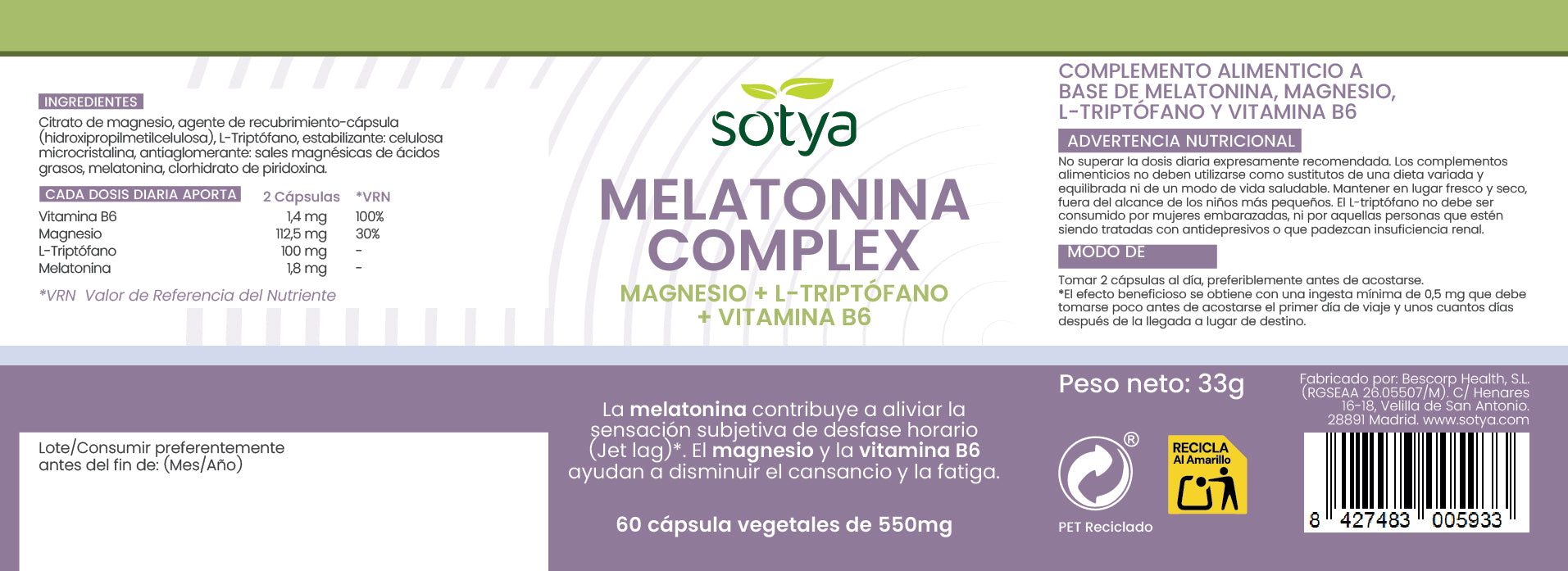 Melatonina Complex Magnesio + L-Triptófano + Vitamina B6 60 cápsulas vegetales de 550mg
