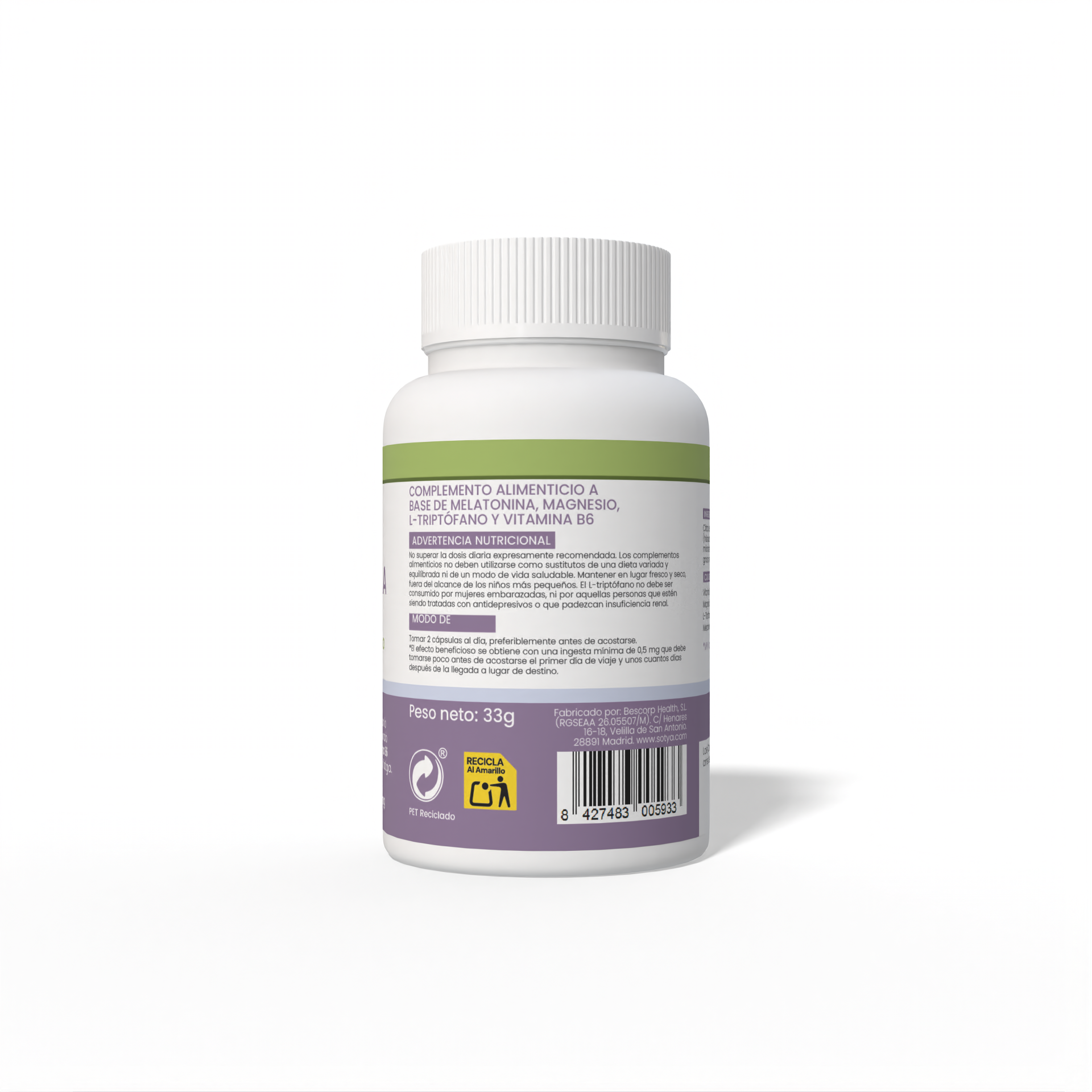 Tomar 2 cápsulas al día, preferiblemente antes de acostarse. * El efecto beneficioso se obtiene con una ingesta mínima de 0,5 mg que debe tomarse poco antes de acostarse el primer día de viaje y unos cuantos días después de la llegada a lugar de destino.